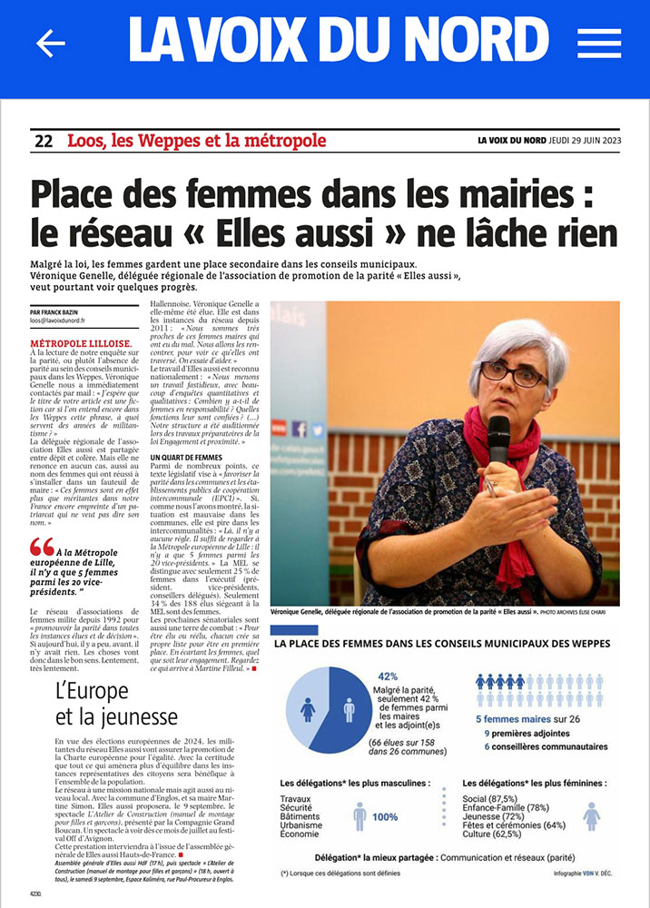 29 juin 2023 : Dans la voix du Nord, un interview de Véronique Genelle sur la place des femmes dans les 26 conseils municipaux des Weppes et à la Métropole Européenne de Lille.