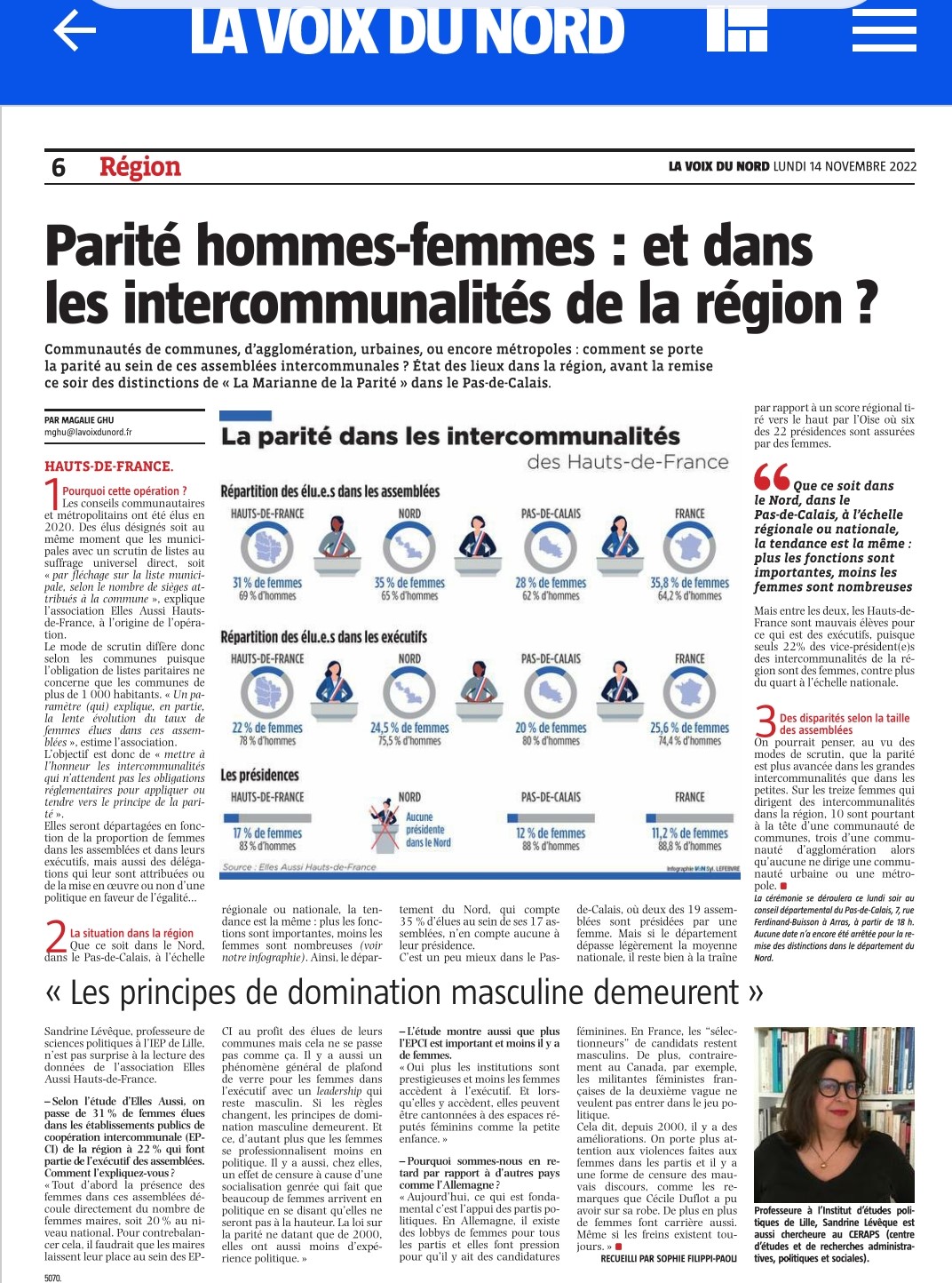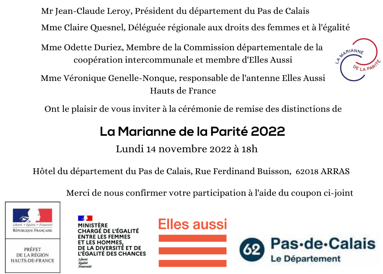 14 novembre 2022 : l'antenne Elles aussi des Hauts de France , dont la responsable est Véronique Genelle-Nonque, a remis les trophées "La Marianne de la Parité dans les EPCI" à Arras à l'Hôtel du département du Pas de Calais. C'est la Communauté de Communes de la région d'Audruicq, présidée par Nicole Chevalier, qui a reçu le premier prix, suivie par la Communauté d'Agglomération du Grand Calais et la Communauté d'Agglomération de Hénin-Carvin.