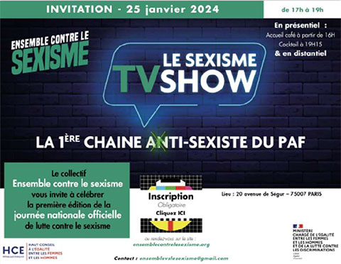 25 janvier 2024 : Pour la première journée nationale contre le sexisme, Le Collectif Ensemble Centre le Sexisme, créé en 2017 et fort de sa quarantaine d’associations membres, a organisé un colloque qui, cette année, a pris la forme d’un « Sexisme TV SHOW ». Cet évènement, mêlant humour et gravité, faisait écho au rapport alarmant du Haut Conseil à l’Égalité sur l’état des lieux du sexisme en France, diffusé trois jours plus tôt.