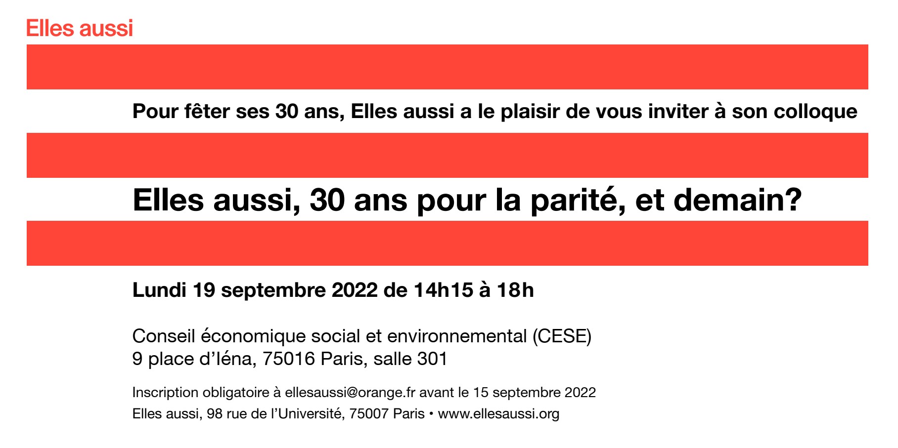 Septembre 2022 : Pour fêter ses 30 Elles aussi organise un colloque le 19 septembre « Elles aussi, 30 ans pour la parité, et demain ? ».
