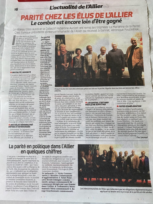Octobre 2022 : Le réseau Elles aussi et le Collectif Hubertine Auclert organisent une remise de distinctions « La Marianne de la Parité dans les EPCI » et une table-ronde sur la parité dans le département de l’Allier le mardi 15 novembre 2022 à Gannat à 19h au cinéma Le Chardon.