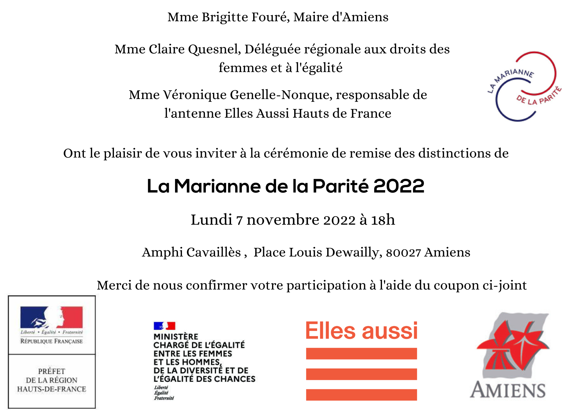 Octobre 2022 : Dans le département de la Somme, l’antenne d’Elles aussi Hauts de France, la Maire d’Amiens et la Déléguée régionale aux droits des femmes vont remettre les distinctions « La Marianne de la Parité dans les EPCI » le lundi 7 novembre 2022 à Amiens, Amphi Cavaillès, place Louis Dewailly