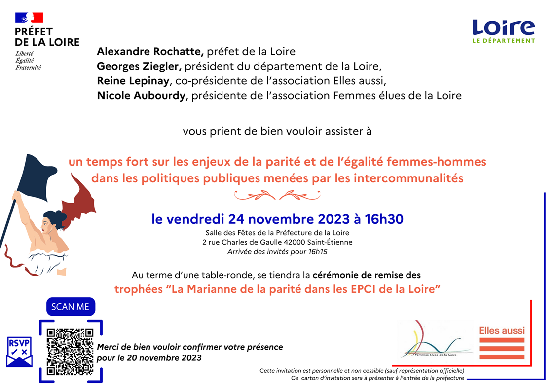 24 novembre 2023 : En Préfecture de la Loire, Nicole Aubourdy Présidente de l’association Femmes élues de la Loire et Reine Lépinay co-Présidente d’Elles aussi remettent la Marianne de la Parité des EPCI de la Loire avec la participation: Alexandre ROCHATTE, Préfet de la Loire, Clarisse LESEIGNEUR, Déléguée départementale aux Droits des Femmes et à l’Égalité, Georges ZIGLER, Président du Conseil Départemental de la Loire, Cécile CUKIERMAN, Sénatrice et Quentin BATAILLON, Député, co-présidents du Jury, Siham LABICH, 4e Vice-Présidente Saint Etienne Métropole, en charge de la cohésion sociale, politique de la ville, du handicap, de la lutte contre les discriminations et de l’économie circulaire, Marianne DARFEULLE, 12ère Vice-Présidente CC Forez est en charge de la mutualisation- Contractualisation, Charles LABOURÉ, Président Communauté de Communes Pays d’Urfé, Maire de Chérier, lauréat de la Marianne.
