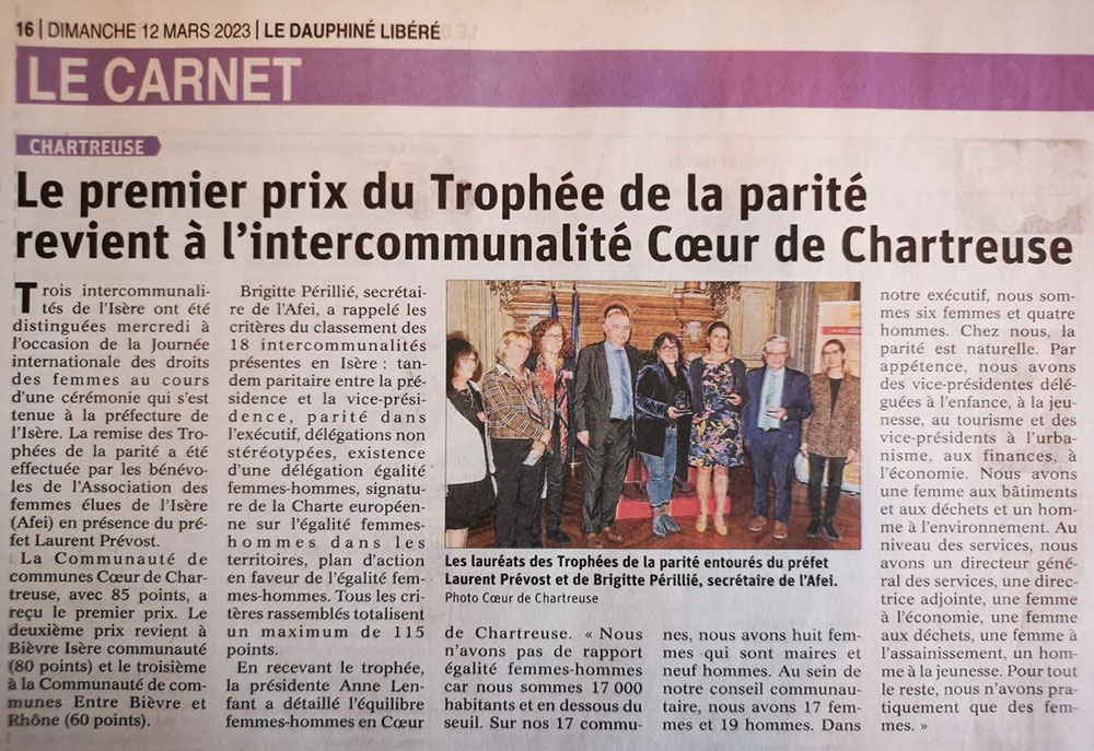 25 septembre 2023 : La cérémonie de La Marianne de la Parité des EPCI du département de l’Ain s’est déroulée en Préfecture de l’Ain en présence de la préfète Chantal Mauchet , et d'élu.es du département. Avant la remise des distinctions, une table ronde : « Parité dans les institutions politiques locales, utopie ou réalité ? La Parité, un levier de transformation des pratiques démocratiques pour une réelle égalité entre les femmes et les hommes ».