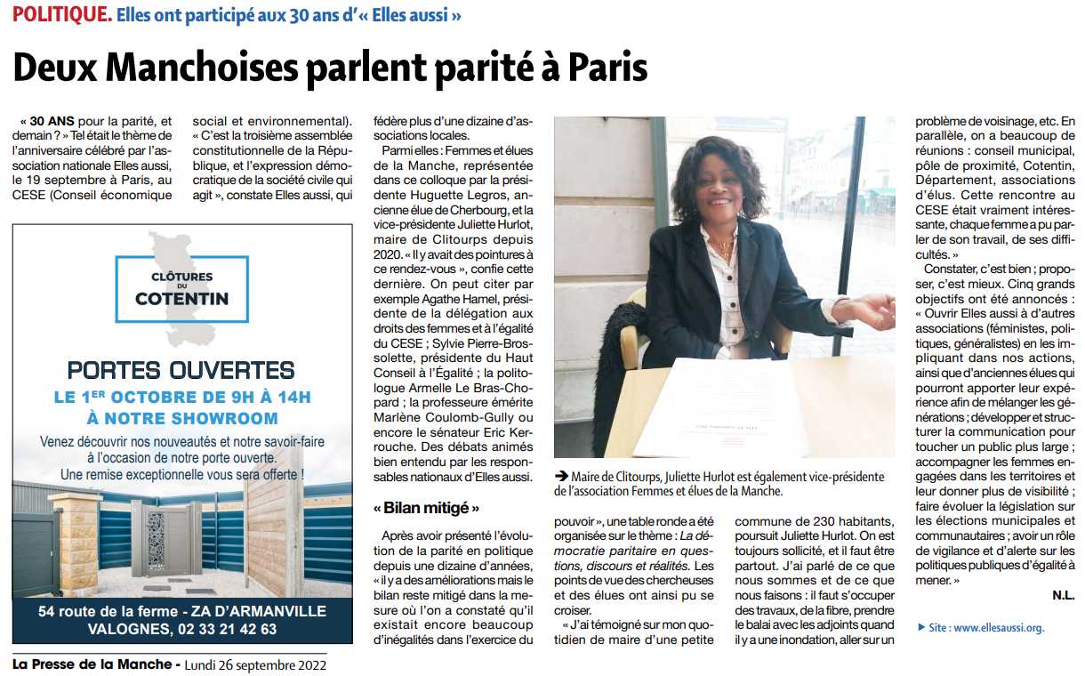 3 Octobre 2022 : Suite à leur participation au colloque organisé pour les 30 ans d'Elles aussi au CESE, Huguette Legros présidente de "Femmes et élues de la Manche" association membre d'Elles aussi, et Juliette Hurlot la vice-présidente, ont été interviewées par La Presse de la Manche et Ouest France. Juliette Hurlot est actuellement la maire de Clitourps dans la Manche.