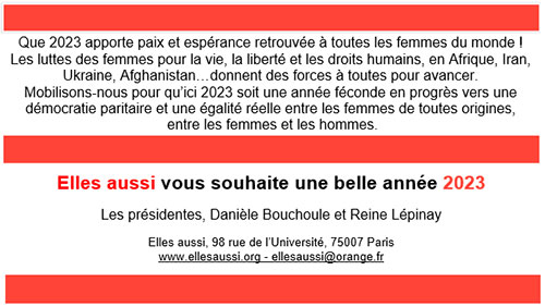15 janvier 2024: Les membres de l’association Elles aussi vous souhaitent une très belle année 2024. Dans la visio ci-jointe, nos deux co-présidentes Reine lepinay et Véronique Genelle vous présentent leurs vœux en abordant deux thèmes qui nous sont chers: la parité dans toutes les instances élues et les élections européennes du 9 juin.
