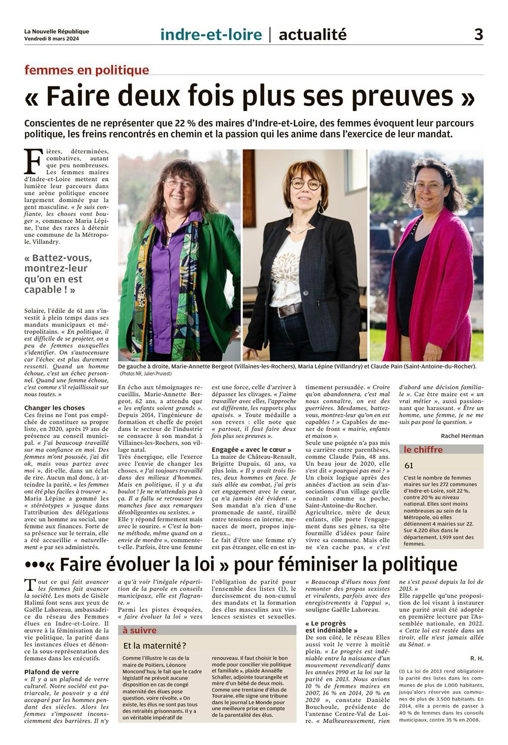 08 mars 2024 : Des femmes maires d'Indre et Loire évoquent leur parcours politique et Danièle Bouchoule, responsable de l'antenne Centre-Val de Loire d'Elles aussi, rappelle que l'on attend toujours une loi pour instaurer la parité dans toutes les communes.
