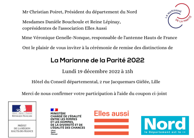 Octobre 2022 : Dans le département de la Somme, l’antenne d’Elles aussi Hauts de France, la Maire d’Amiens et la Déléguée régionale aux droits des femmes vont remettre les distinctions « La Marianne de la Parité dans les EPCI » le lundi 7 novembre 2022 à Amiens, Amphi Cavaillès, place Louis Dewailly