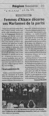 3 décembre 2022 : paru dans l’Alsace : « Femmes d’Alsace décerne ses Mariannes de la parité »