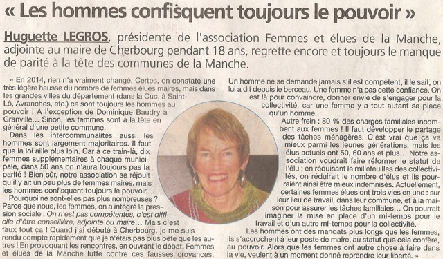- 20 avril 2014 : les municipales : "les hommes confisquent toujours le pouvoir" interview dans la Presse de la Manche d'Huguette Legros, Vice Présidente d'Elles aussi et Présidente de Femmes et Élues de la Manche. lire la suite